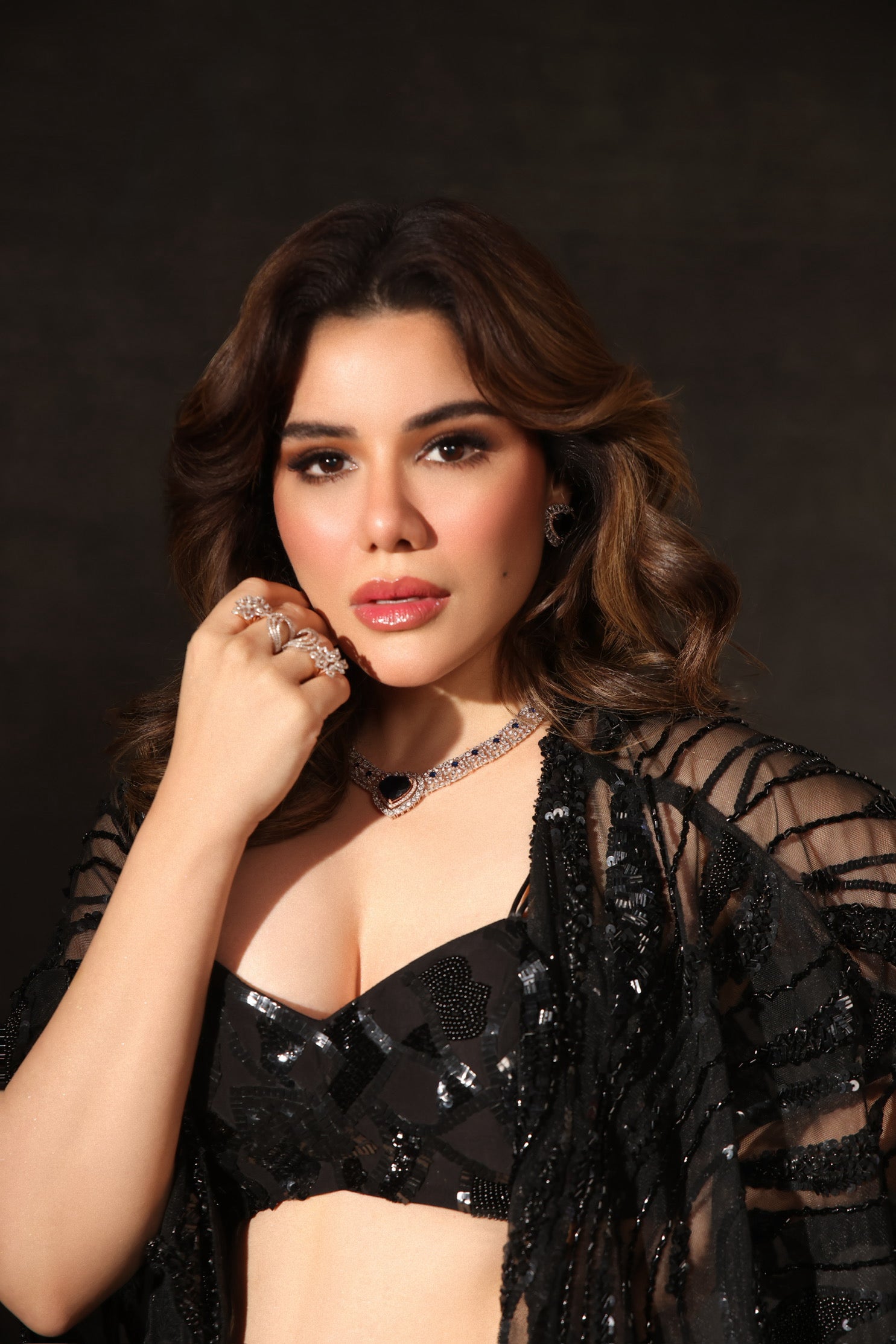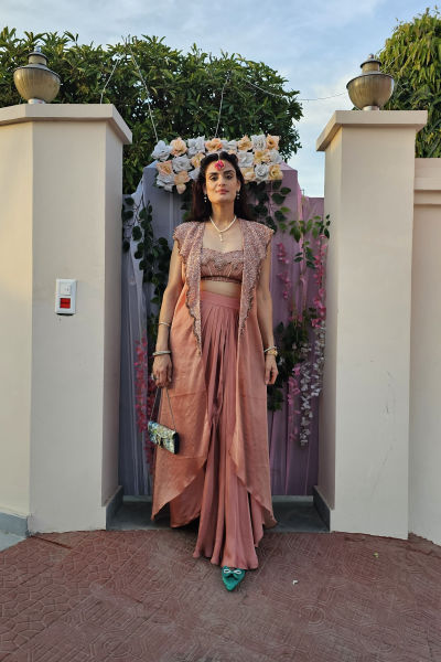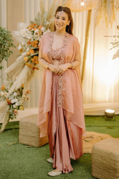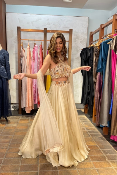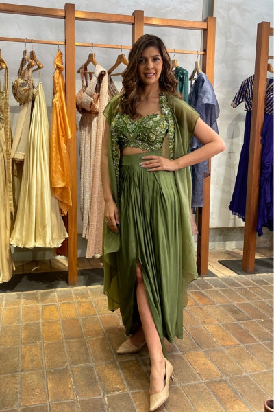 Featuring a hand embroidered resham, zardosi, pearls and sequence? cutwork bustier with tie-up drawstring at back, a drape skirt in silk satin . It is teamed up with? cutwork organza satin cape. Mo... -