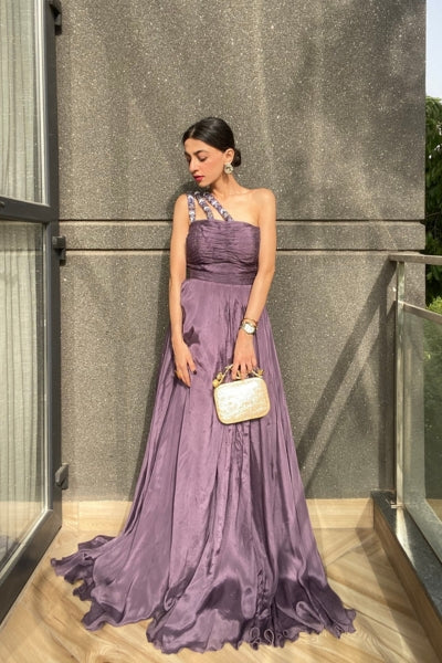 Components - 3pc (Blouse, Drape Saree) Fabric - Drape Saree - Foil Georgette, Blouse - Crepe, Cape - TulleFit - Fitted at the bust and waist Colour - Purple Lining - AttachedStyle Code - OKO-BT-00... -