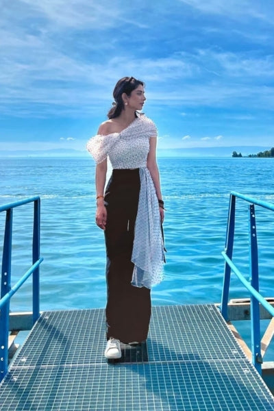 Components - 3pc (Blouse, Drape Saree & Belt) Fabric - Blouse - Organza, Saree - Shimmer SilkFit - Fitted at the bust and waist Colour - Ivory Lining - AttachedStyle Code - OKO-BT-003S Featurin... -