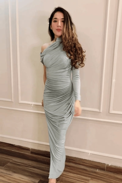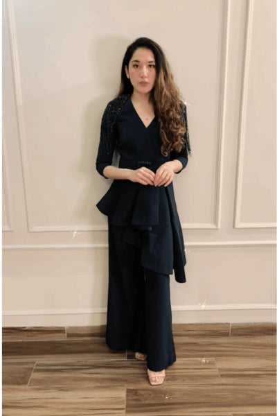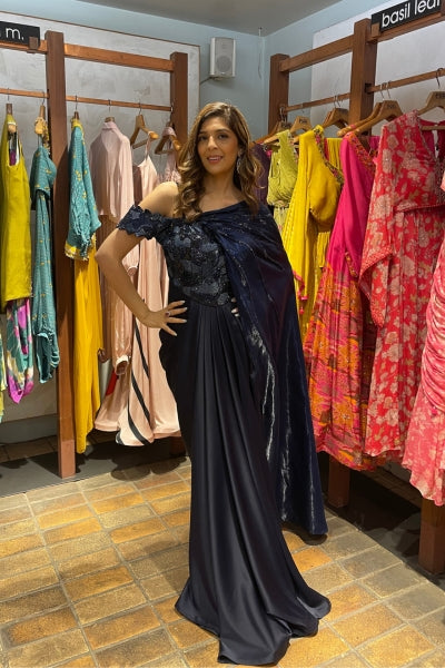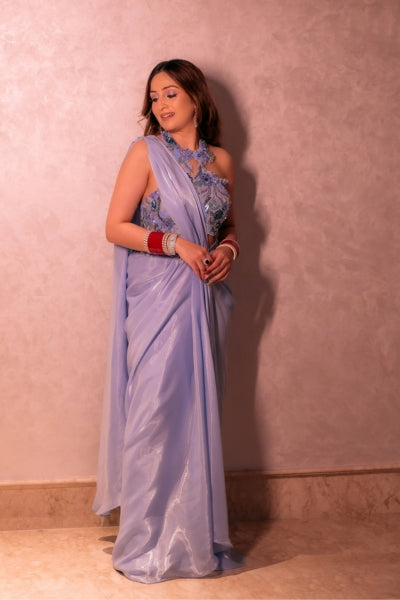 Teal Off Shoulder Pre-stitch Drape Saree Set