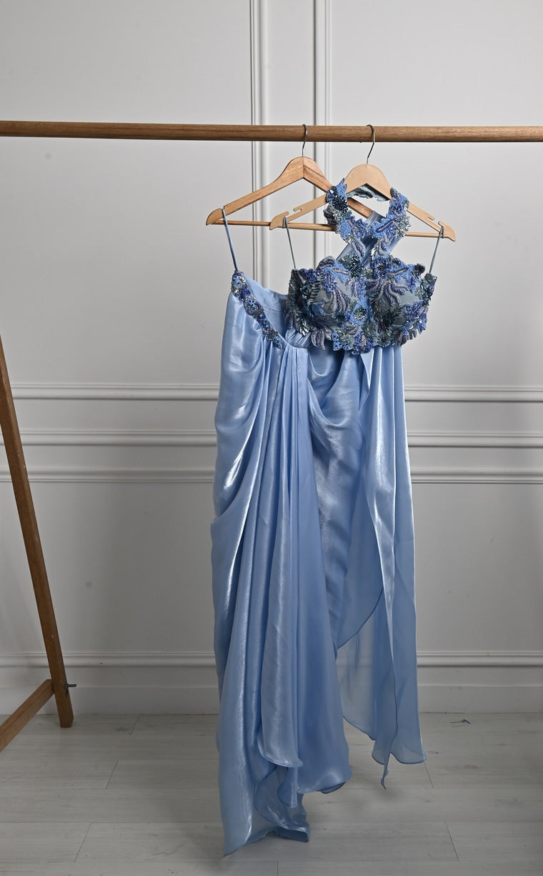 Halter neck cutwork blouse , fully hand embroidered in hues of soft blues and easy to tie fuss free pre stitch drape saree