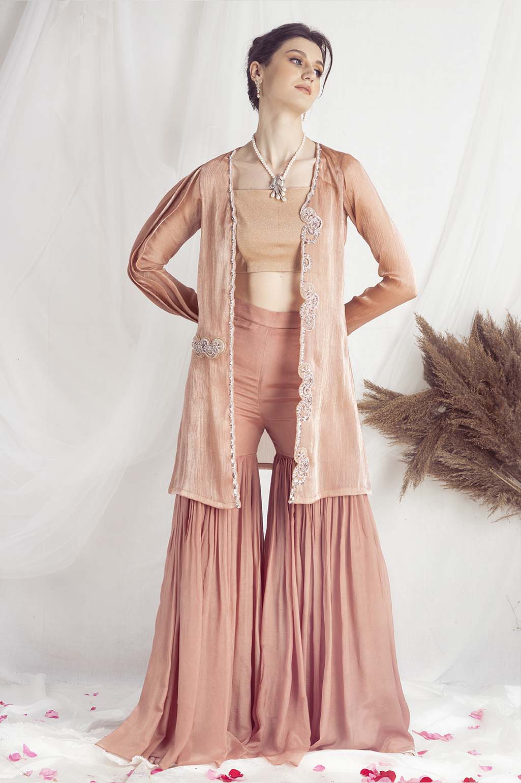 - Fabric- wrinkled organza (cape ) , metallic jersey bustier , chiffon sharara