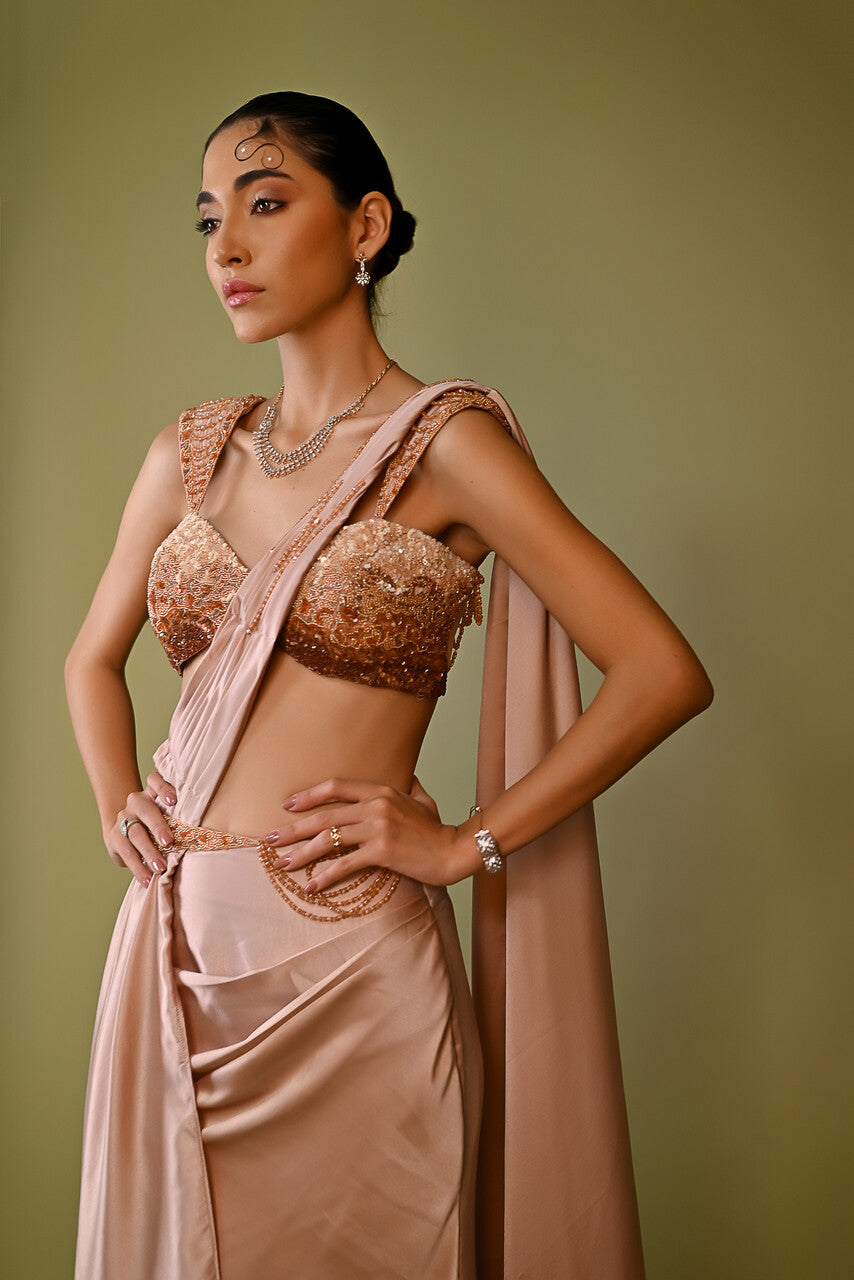 Beige ombre shaded pre stitched saree