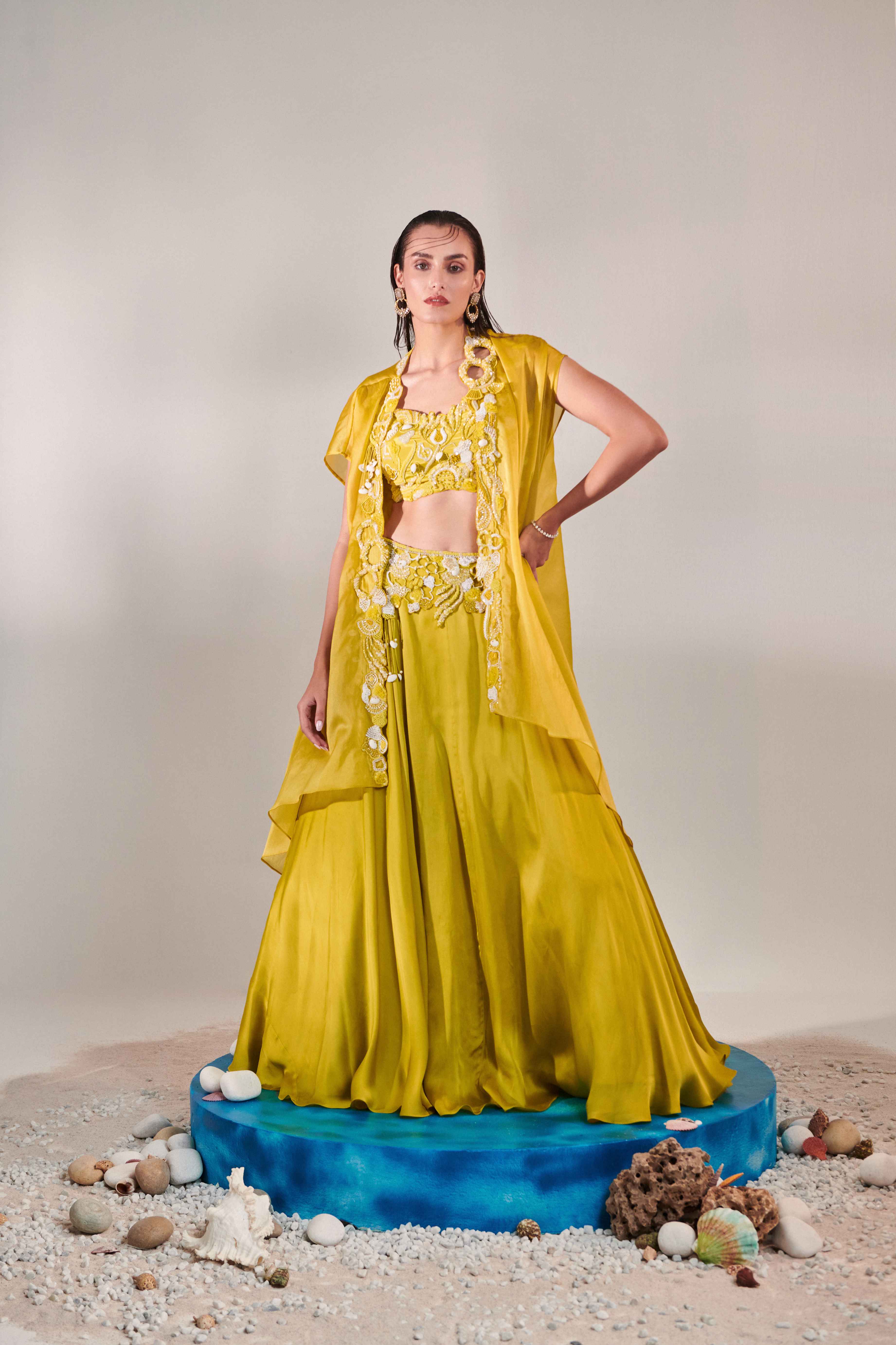 - Components: 3(satin organza lehenga; satin organza cape; crepe blouse)