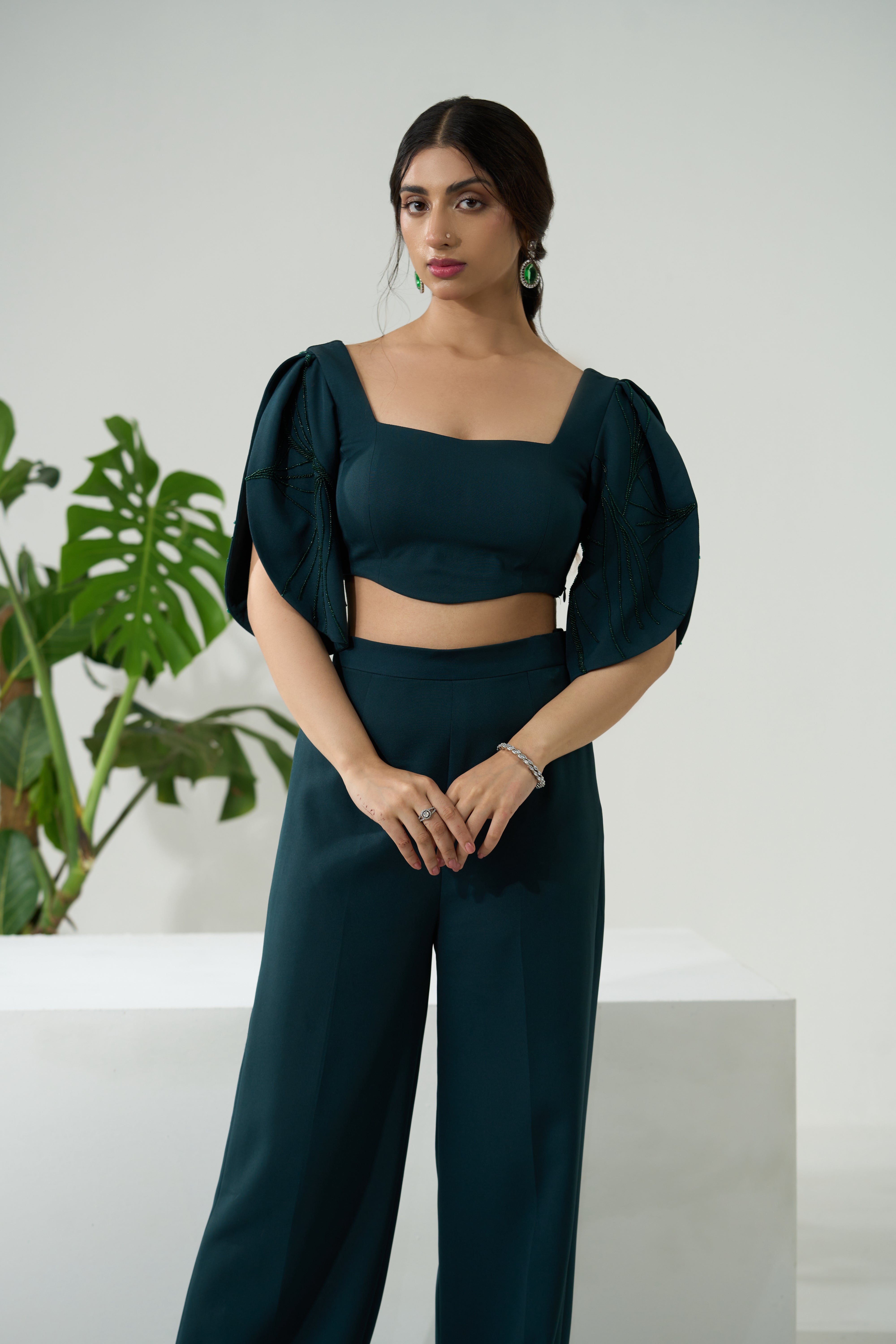 Featuring Banana Crepe Lycra Crop Top with Leaf Sleeves comes with Pants.