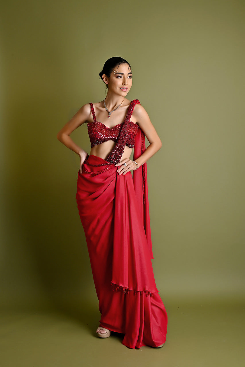 Featuring cutwork blouse , fully hand embroidered with ombre shading effect in hues of reds and maroons. Also featuring hand embroidered cutwork palla and braided details on the pre stitch drape saree