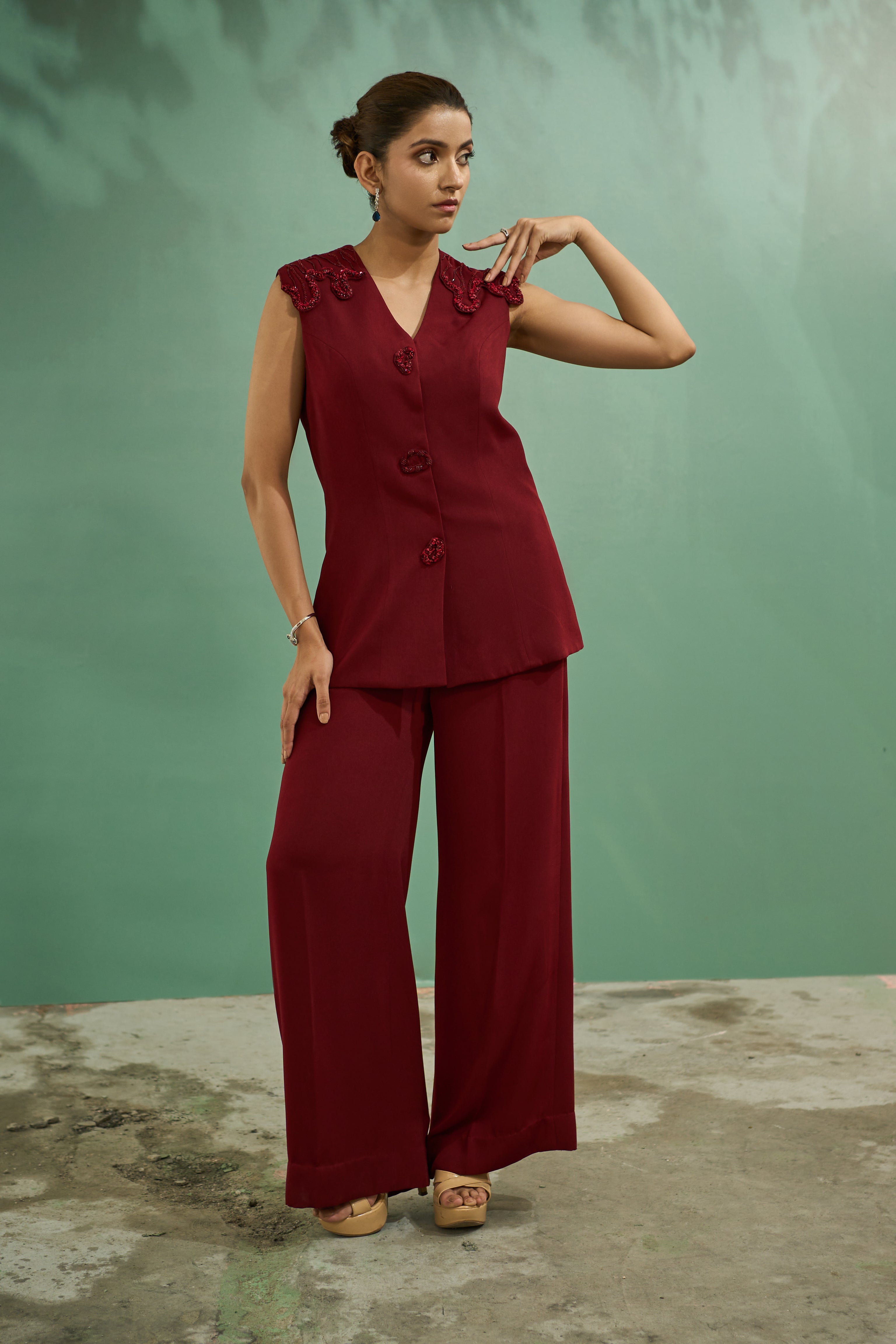 Featuring sleeveless with V neck line geogette top with silk satin pants in red colour. Finely hand crafted using traditional embroidery with resham, katdana, sequence, beads