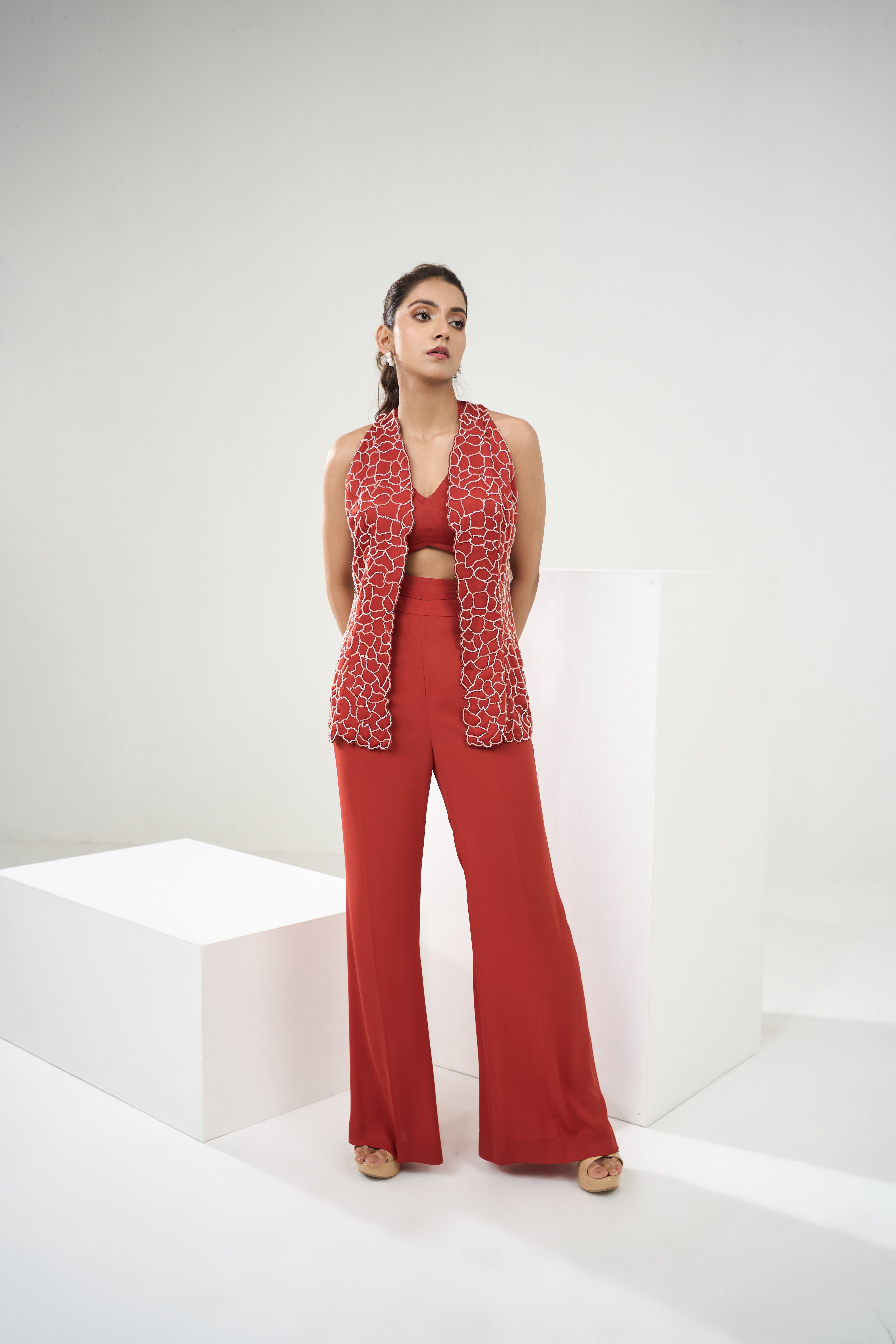 Featuring Rust Orange Sleeveless Blazer full hand emroidered in silk satin comes with silk halter neck bustier and pants.