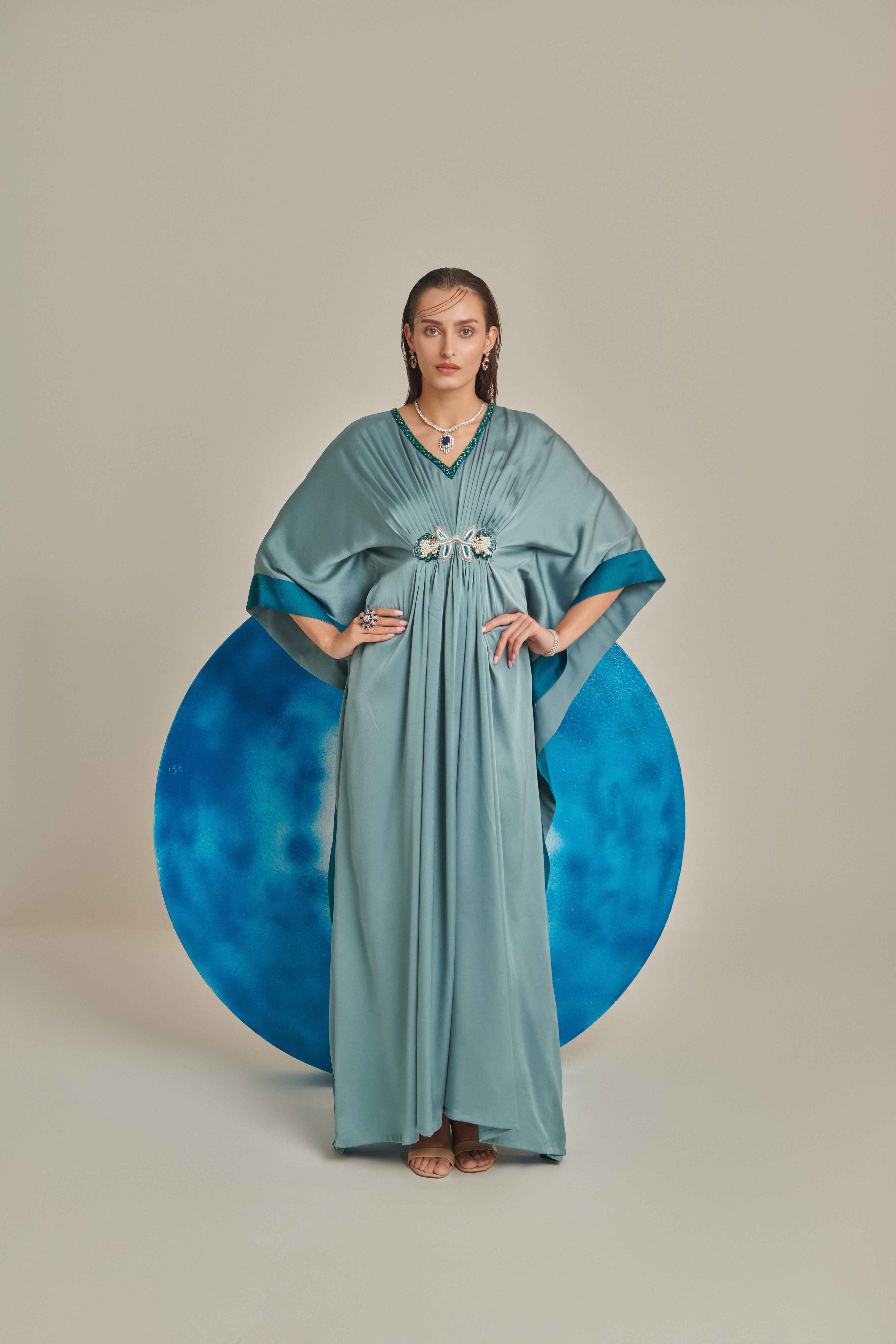 - Sea green kaftan with hand embroidered details of pearls, katdana, rhinestones, beads