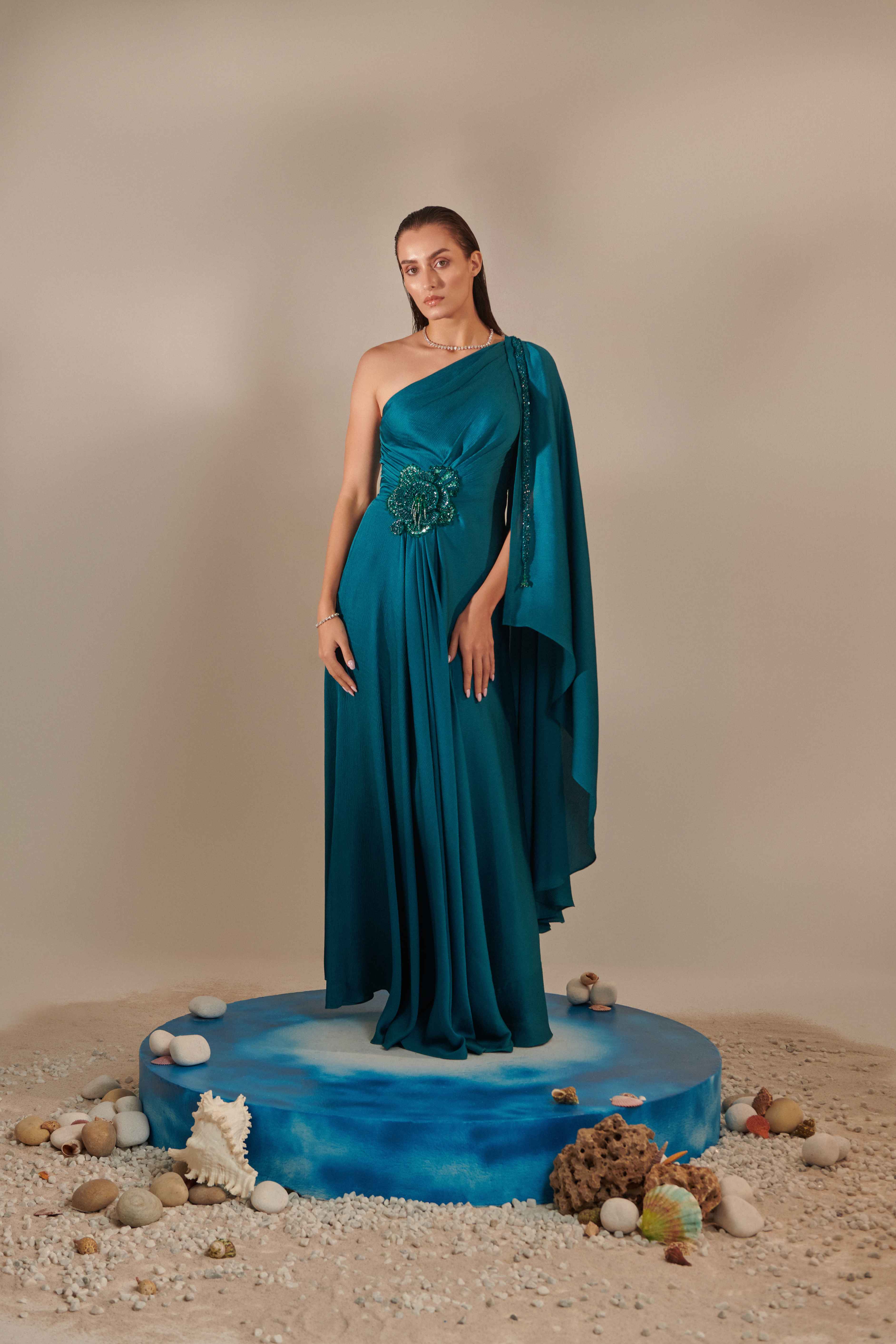 - Teal one shoulder drape gown ; hand embroidered 3d shells at waist, 3 hand embroidered chains at the sleeve; asymmetric open drape sleeve